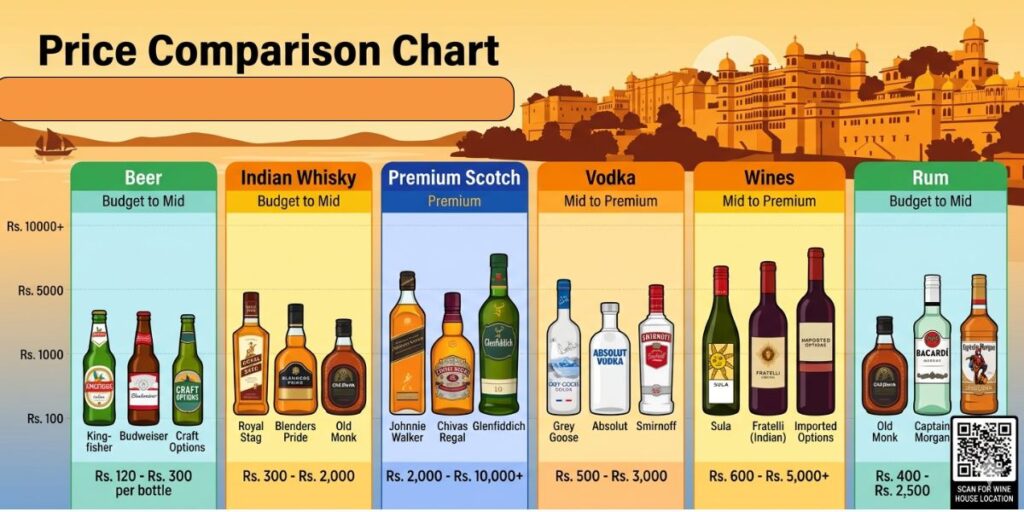 Prices include all state taxes and excise duties. Rajasthan’s liquor prices tend to be moderate compared to states like Kerala or Tamil Nadu.